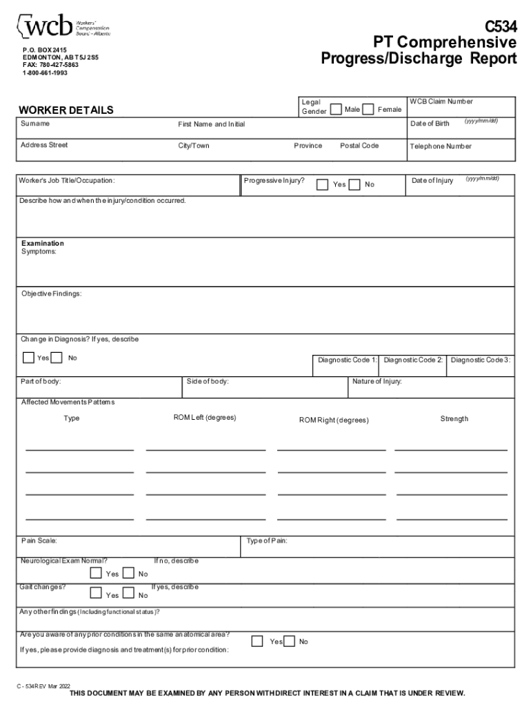 C534 PT Comprehensive Progress/Discharge Report. O. BOX 2415 EDMONTON, AB T5J 2S5 FAX: 7804275863 18006611993Legal Wanderwörter DETAILS SurnameFirst Name and InitialAddress Streetcar/Nonworker\'s