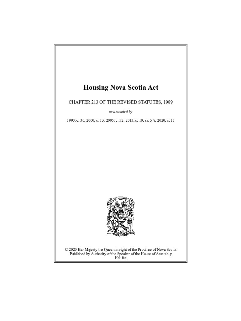 Housing Nova Scotia Act CHAPTER 213 OF THE REVISED STATUTES, 1989 as amended by 1990, c. 30; 2000, c. 13; 2005, c. 52; 2013, c. 10, SS. 58; 2020, c. 11 2020 Her Majesty the Queen in right of the Province