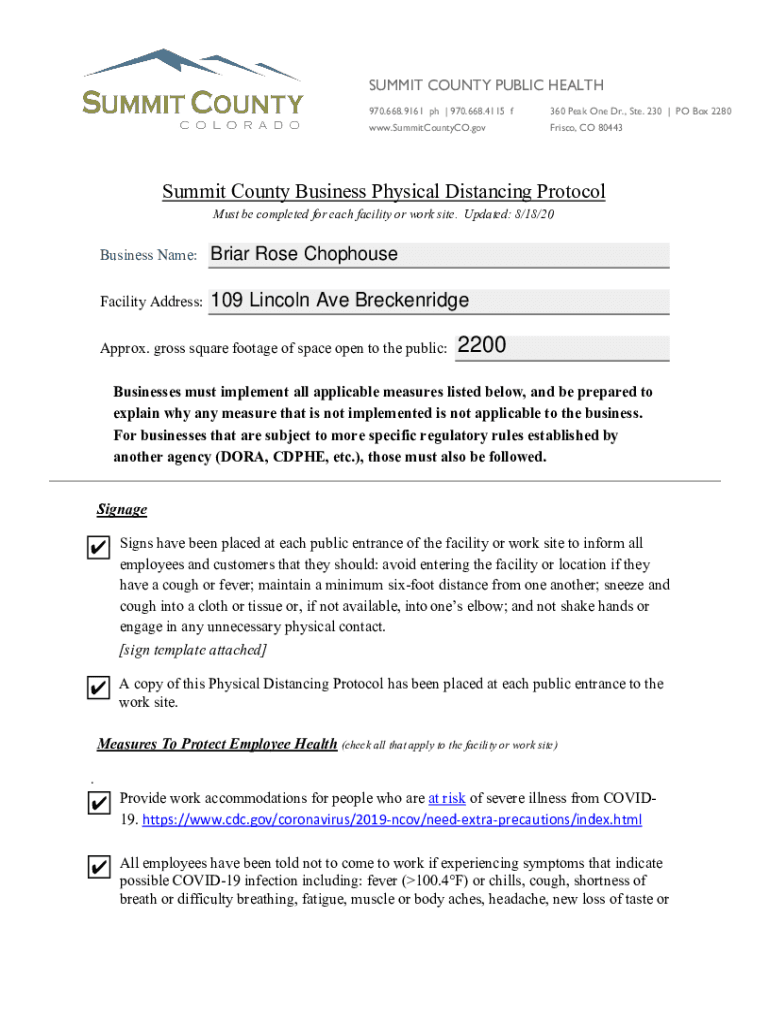 SUMMIT COUNTY PUBLIC HEALTH 970.668.9161 pH | 970.668.4115 f360 Peak One Dr., Ste. 230 | PO Box 2280www. SummitCountyCO.gov Frisco, CO 80443Summit County Business Physical Distancing Protocol Must