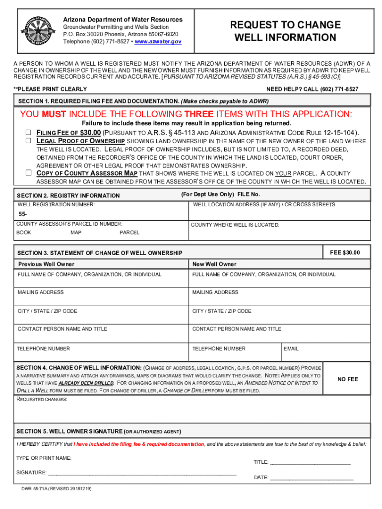 Arizona Department of Water Resources Groundwater Permitting and Wells Section P.O. Box 36020 Phoenix, Arizona 850676020 Telephone (602) 7718527 www.azwater.govREQUEST TO CHANGE WELL INFORMATION PERSON