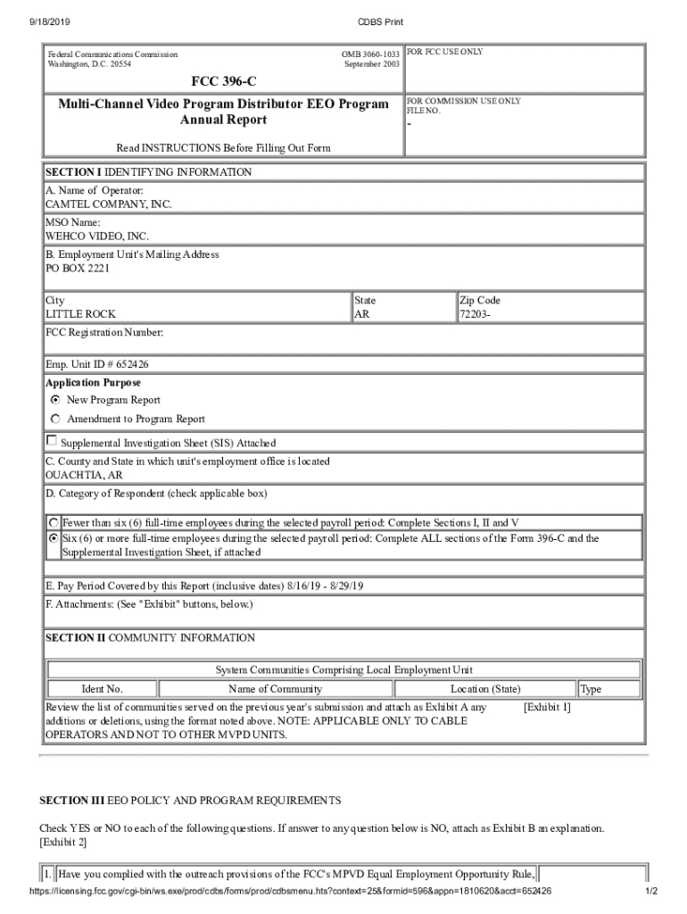 9/18/2019CDBS Print OMB 30601033 FOR FCC USE ONLY September 2003Federal Communications Commission Washington, D.C. 20554FCC 396C Multichannel Video Program Distributor EEO Program Annual Reporter