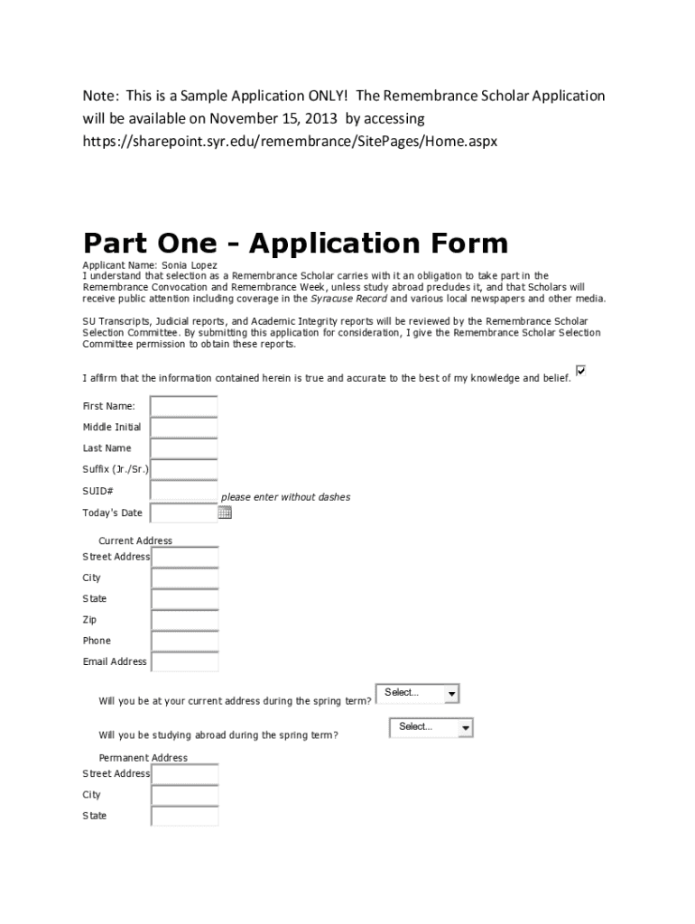 Note:ThisisaSampleApplicationONLY! TheRemembranceScholarApplication willbeavailableonNovember15,2013byaccessing https://sharepoint.syr.edu/remembrance/SitePages/Home.aspxPart One Application Form
