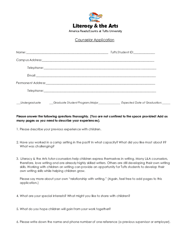 Literacy & the Arts America Reads/Counts at Tufts UniversityCounselor Application Name:___ Tufts Student ID:___ Campus Address:___ Telephone:___ Email:___ Permanent Address:___ Telephone:______Undergraduate___Graduate