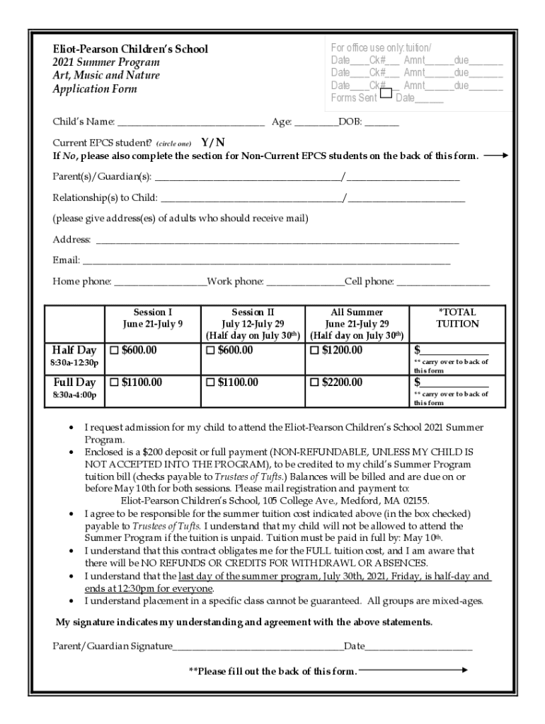 Eliot Pearson Children's School 2021 Summer Program Art, Music and Nature Application Former office use only:tuition/ Date___Ck#___ Amnt___due___ Date___Ck#___ Amnt___due___ Date___Ck#___ Amnt___due___