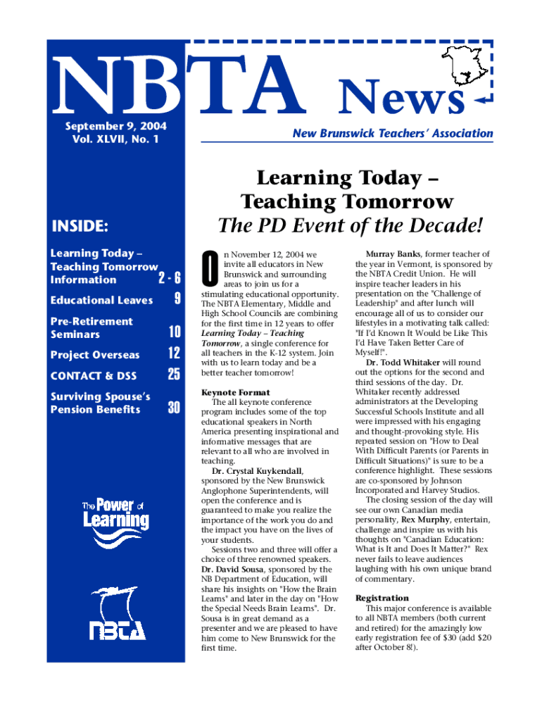 NITA September 9, 2004, Vol. CLVII, No. 1New Brunswick Teachers AssociationLearning Today Teaching Tomorrow The PD Event of the Decade!INSIDE: Learning Today Teaching Tomorrow Information 26 Educational