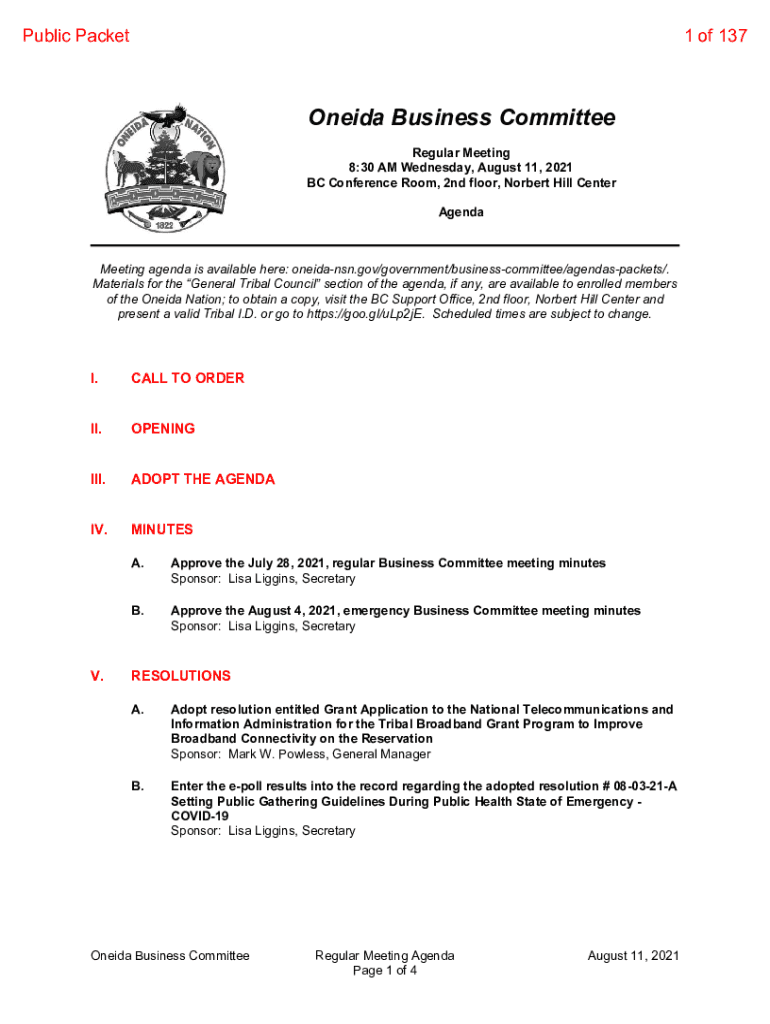 Public Packet1 of 137Oneida Business Committee Regular Meeting 8:30 AM Wednesday, August 11, 2021, BC Conference Room, 2nd floor, Norbert Hill Center AgendaMeeting agenda is available here: oneidansn.gov/government/businesscommittee/agendaspackets/.