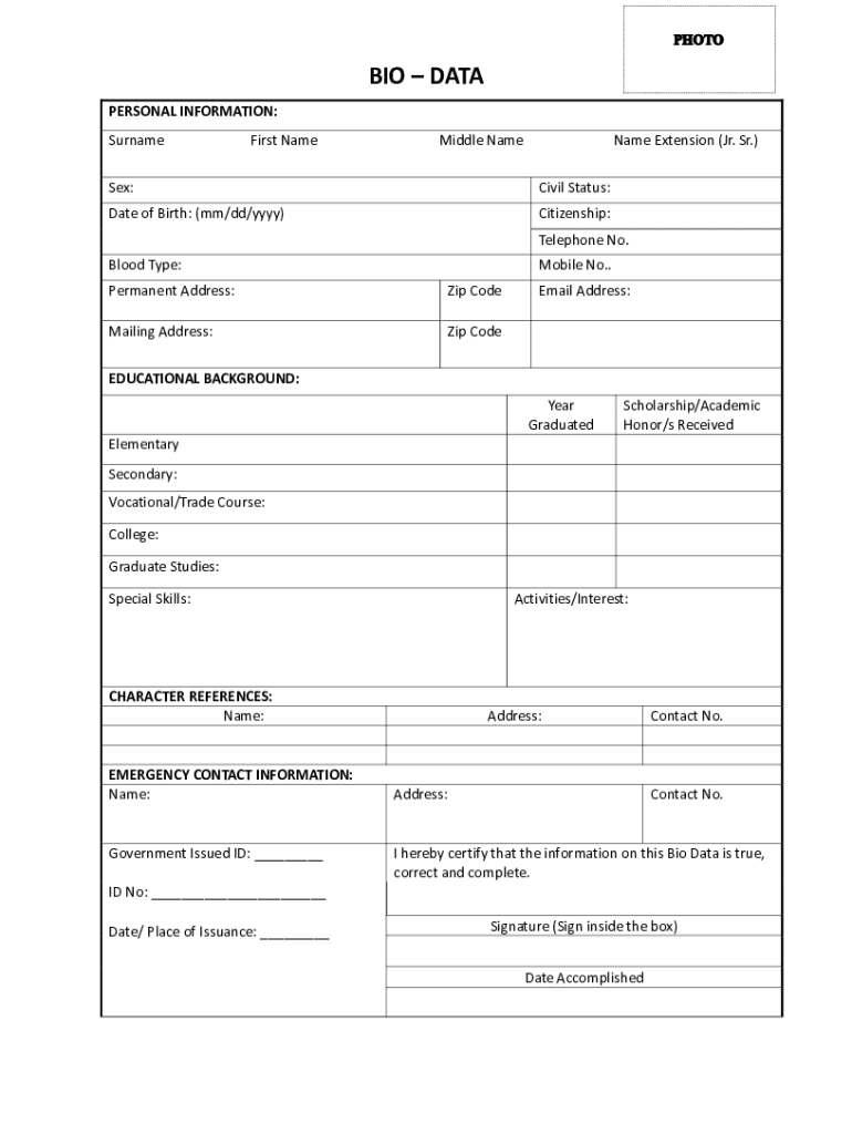 BIO DATA PERSONAL INFORMATION: SurnameFirst NameMiddle Namesake Extension (Jr. Sr.) Sex:Civil Status:Date of Birth: (mm/dd/YYY)Citizenship: Telephone No. Blood Type:Mobile No. Permanent Address:Zip