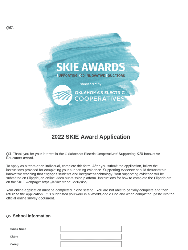 Q67.2022 SKIN Award Application Q3. Thank you for your interest in the Oklahoma\'s Electric Cooperatives\'Supporting K20 Innovative Educators Award. To apply as a team or an individual, complete this