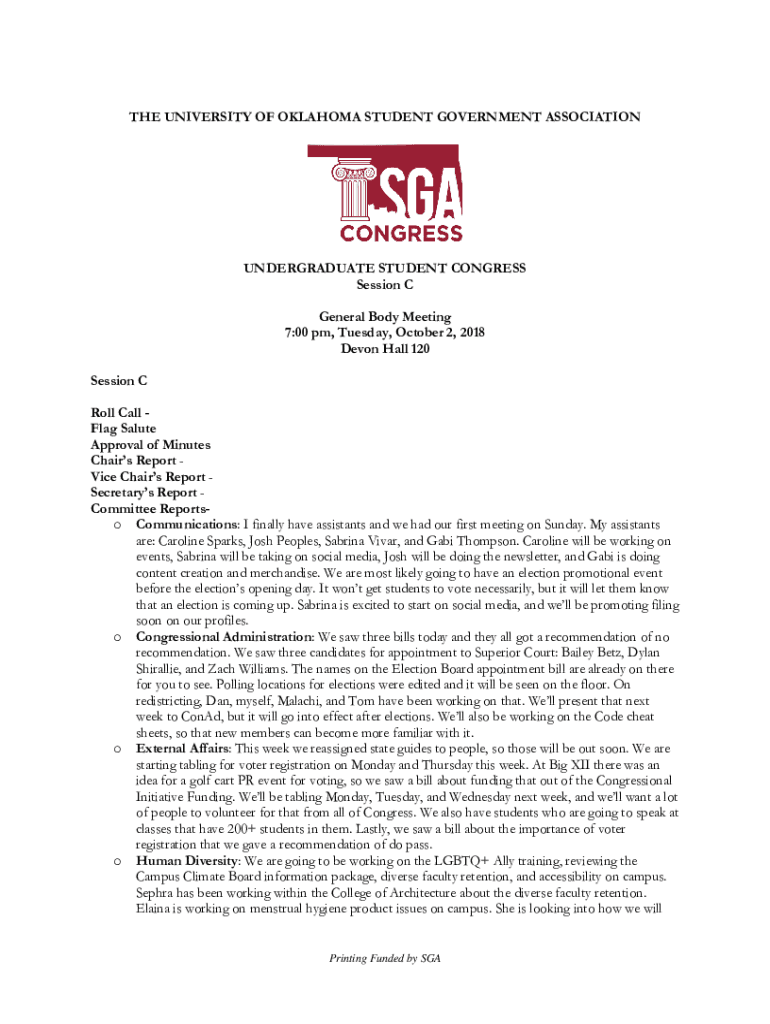 THE UNIVERSITY OF OKLAHOMA STUDENT GOVERNMENT ASSOCIATIONUNDERGRADUATE STUDENT CONGRESS Session C General Body Meeting 7:00 pm, Tuesday, October 2, 2018, Devon Hall 120 Session C Roll Call Flag Salute