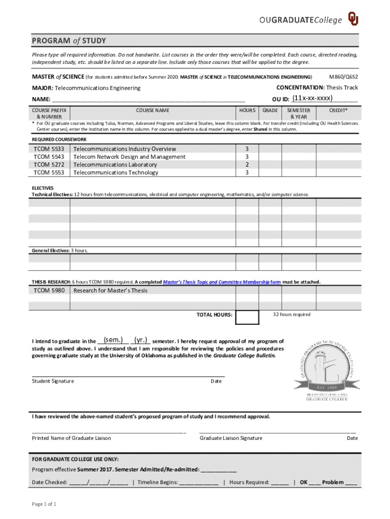 PROGRAM of STUDY Please type all required information. Do not handwrite. List courses in the order they were/will be completed. Each course, directed reading, independent study, etc. should be listed