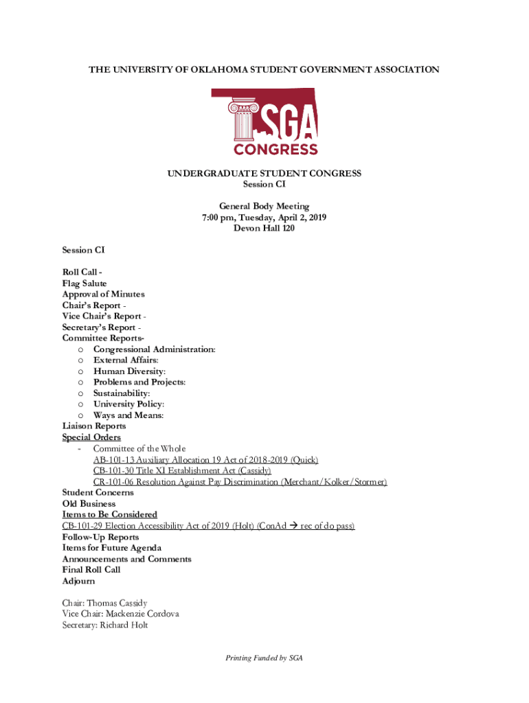 THE UNIVERSITY OF OKLAHOMA STUDENT GOVERNMENT ASSOCIATIONUNDERGRADUATE STUDENT CONGRESS Session CI General Body Meeting 7:00 pm, Tuesday, April 2, 2019, Devon Hall 120 Session CI Roll Call Flag Salute