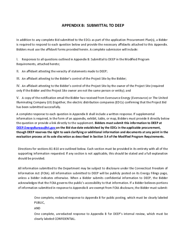 APPENDIX B: SUBMITTAL TO DEEP In addition to any complete Bid submitted to the EDC's as part of the application Procurement Plan(s), a Bidder is required to respond to each question below and provide