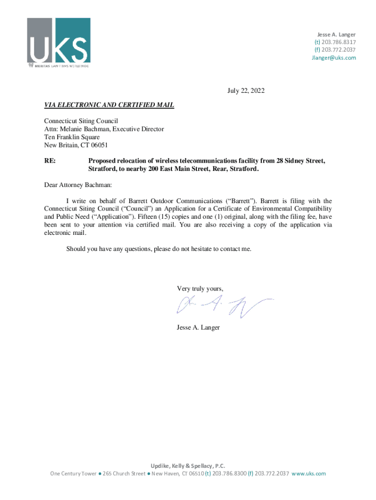 Jesse A. Larger (t) 203.786.8317 (f) 203.772.2037 Jlanger@uks.comJuly 22, 2022 VIA ELECTRONIC AND CERTIFIED MAIL Connecticut Siting Council Attn: Melanie Bach man, Executive Director Ten Franklin