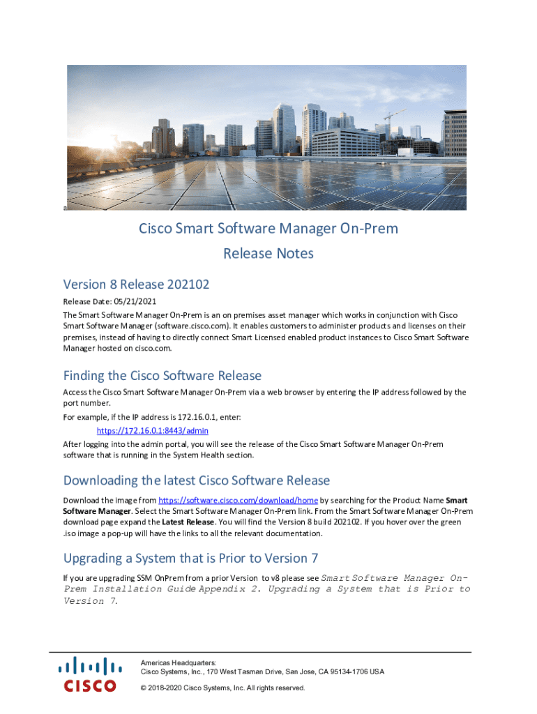ACiscoSmartSoftwareManagerOnPrem ReleaseNotes Version8Release202102 Release Date:05/21/2021 TheSmartSoftwareManagerOnPremisanonpremisesassetmanagerwhichworksinconjunctionwithCisco SmartSoftwareManager(software.cisco.com).