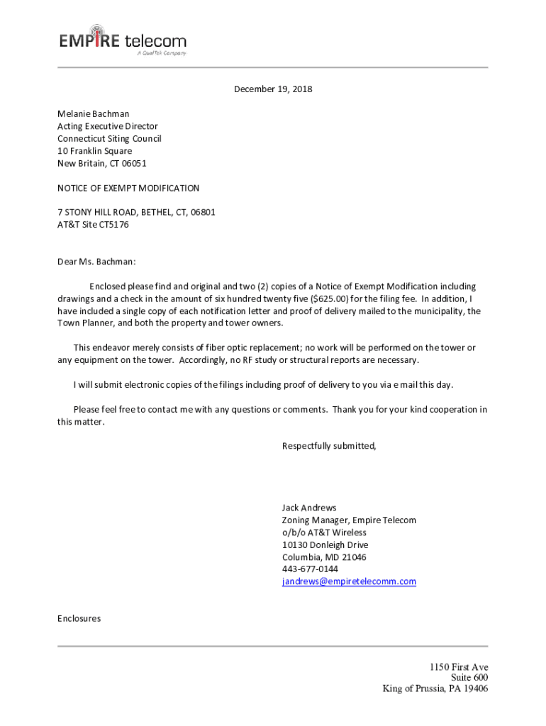 December 19, 2018, Melanie Bach man Acting Executive Director Connecticut Siting Council 10 Franklin Square New Britain, CT 06051 NOTICE OF EXEMPT MODIFICATION 7 STONY HILL ROAD, ETHEL, CT, 06801
