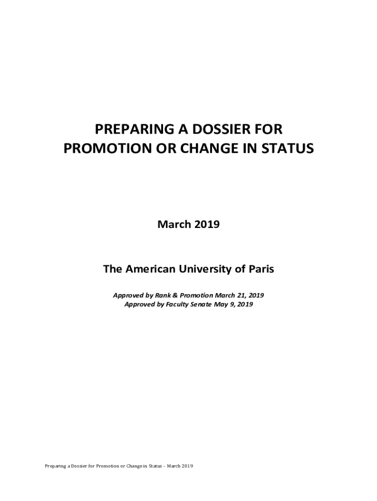 PREPARING A DOSSIER FOR PROMOTION OR CHANGE IN STATUS March 2019The American University of Paris Approved by Rank & Promotion March 21, 2019, Approved by Faculty Senate May 9, 2019Preparing a Dossier