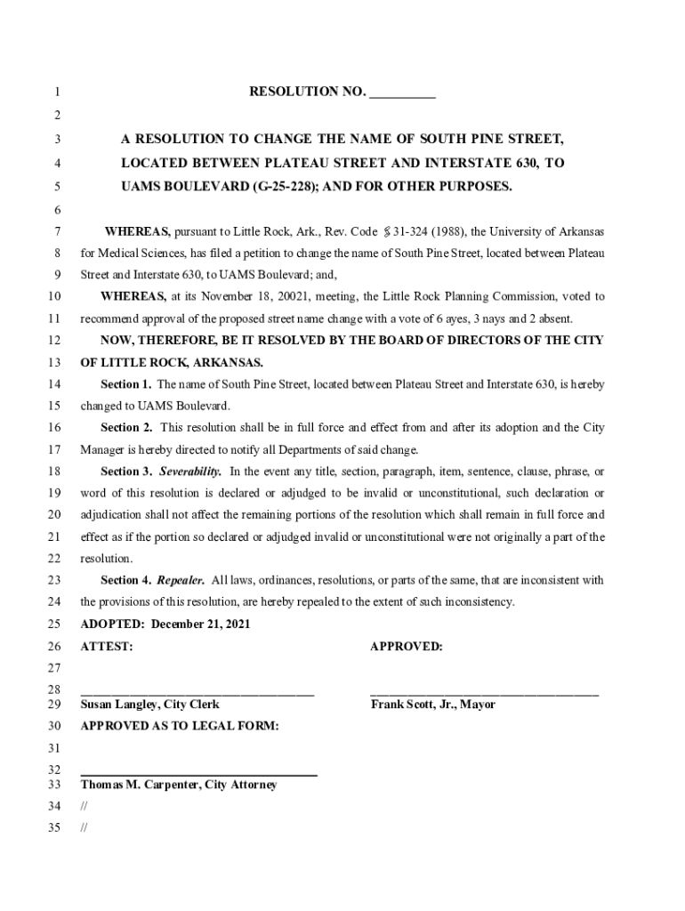 RESOLUTION NO. ___1 2 3A RESOLUTION TO CHANGE THE NAME OF SOUTH PINE STREET,4LOCATED BETWEEN PLATEAU STREET AND INTERSTATE 630, TO5UAMS BOULEVARD (G25228); AND FOR OTHER PURPOSES.6 7WHEREAS, pursuant
