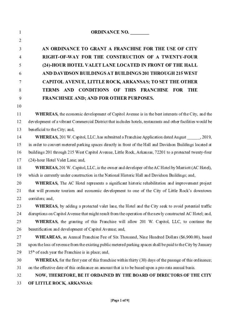ORDINANCE NO. ___1 2 3AN ORDINANCE TO GRANT A FRANCHISE FOR THE USE OF CITY4RIGHTOFWAY FOR THE CONSTRUCTION OF A TWENTYFOUR5(24)HOUR HOTEL VALET LANE LOCATED IN FRONT OF THE HALL6AND DAVIDSON BUILDINGS