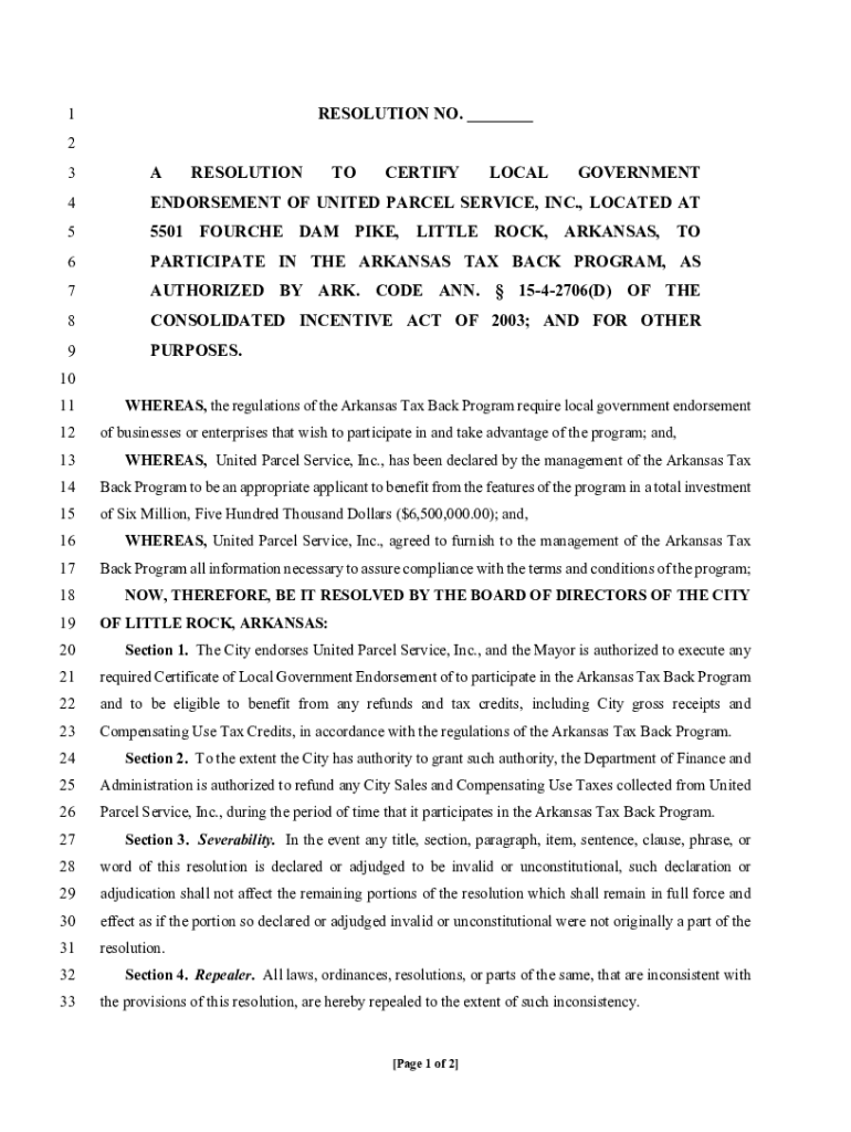 RESOLUTION NO. ___1 2 3ARESOLUTIONTOCERTIFYLOCALGOVERNMENT4ENDORSEMENT OF UNITED PARCEL SERVICE, INC., LOCATED AT55501 FORCE DAM PIKE, LITTLE ROCK, ARKANSAS, TO6PARTICIPATE IN THE ARKANSAS TAX BACK