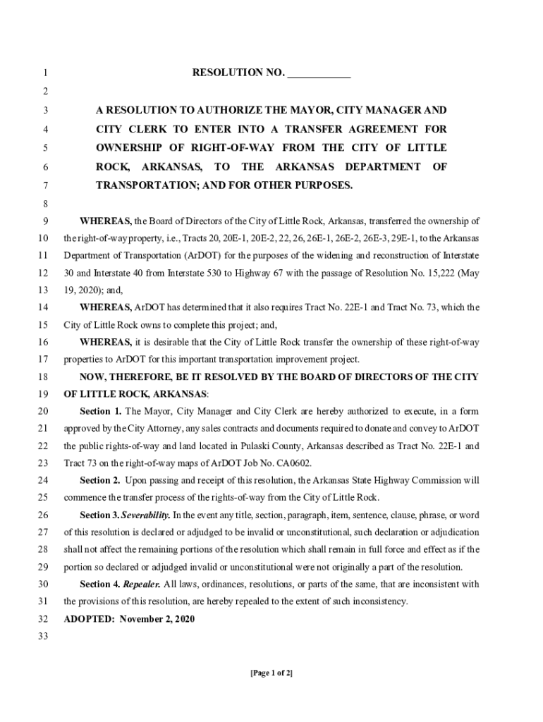 RESOLUTION NO. ___1 2 3A RESOLUTION TO AUTHORIZE THE MAYOR, CITY MANAGER AND4CITY CLERK TO ENTER INTO A TRANSFER AGREEMENT FOR5OWNERSHIP OF RIGHTOFWAY FROM THE CITY OF LITTLE6ROCK,7TRANSPORTATION;