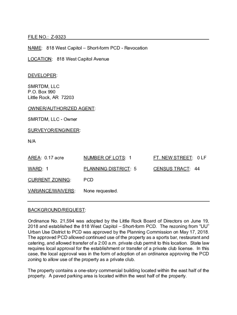 FILE NO.: Z9323 NAME: 818 West Capitol Short form PCD Revocation LOCATION: 818 West Capitol Avenue DEVELOPER: SMR TDM, LLC P.O. Box 990 Little Rock, AR 72203 OWNER/AUTHORIZED AGENT: SMR TDM, LLC Owner