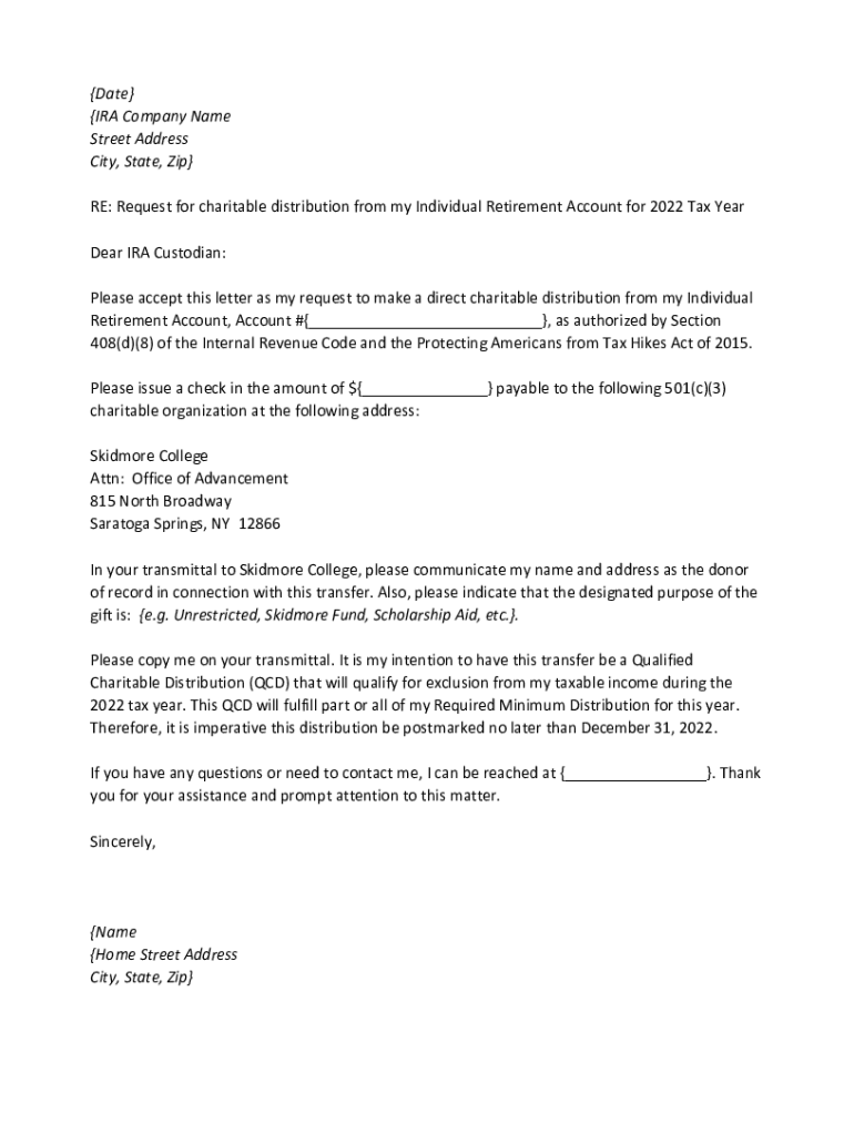 Date IRACompanyName StreetAddress City, State, Zip RE:RequestforcharitabledistributionfrommyIndividualRetirementAccountfor2022TaxYear DearIRACustodian: PleaseacceptthisletterasmyrequesttomakeadirectcharitabledistributionfrommyIndividual