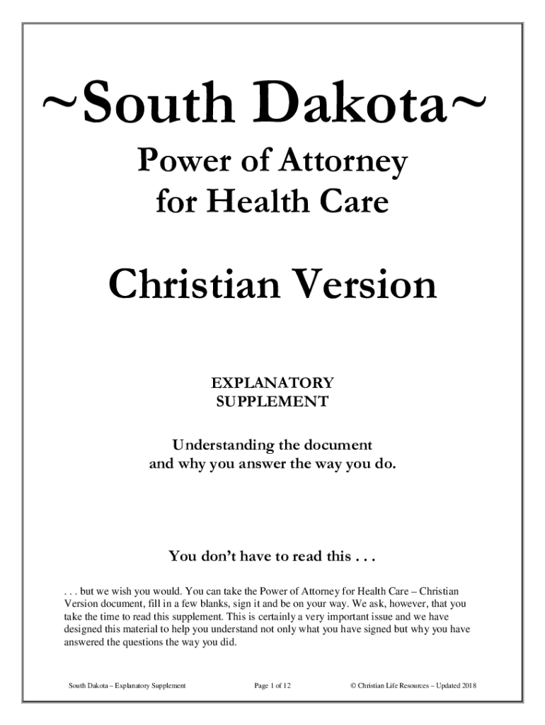 South Dakota Power of Attorney for Health Care Christian Version EXPLANATORY SUPPLEMENT Understanding the document and why you answer the way you do. You don't have to read this. . . . . . But we
