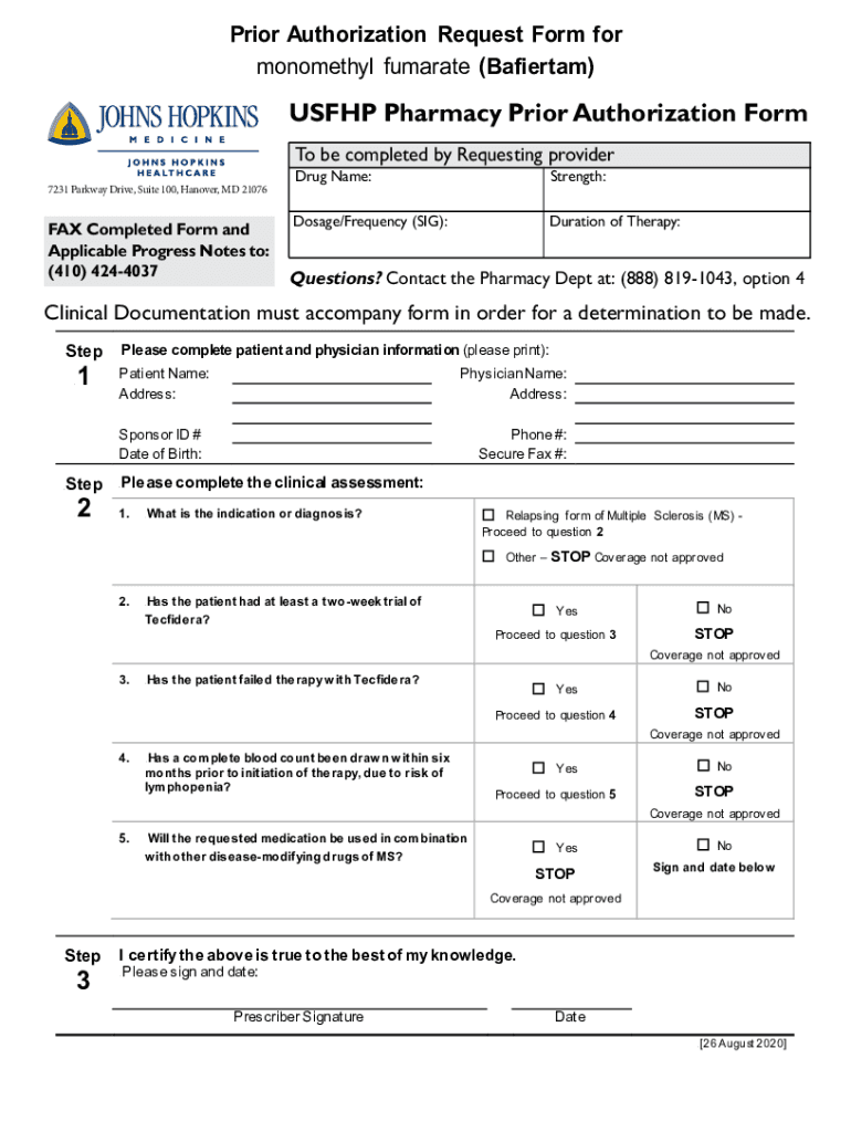 Prior Authorization Request Form for monomethyl fumarate (Bighearted)USF HP Pharmacy Prior Authorization Form To be completed by Requesting provider 7231 Parkway Drive, Suite 100, Hanover, MD 21076FAX