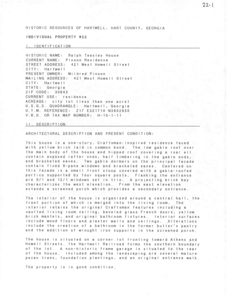 221HISTORIC RESOURCES OF HARTWELL, HART COUNTY, GEORGIA INDIVIDUAL PROPERTY #22 I. I DENT I F I CAT I ON___ ___HISTORIC NAME: Ralph Beasley House CURRENT NAME: Pinion Residence STREET ADDRESS: 421