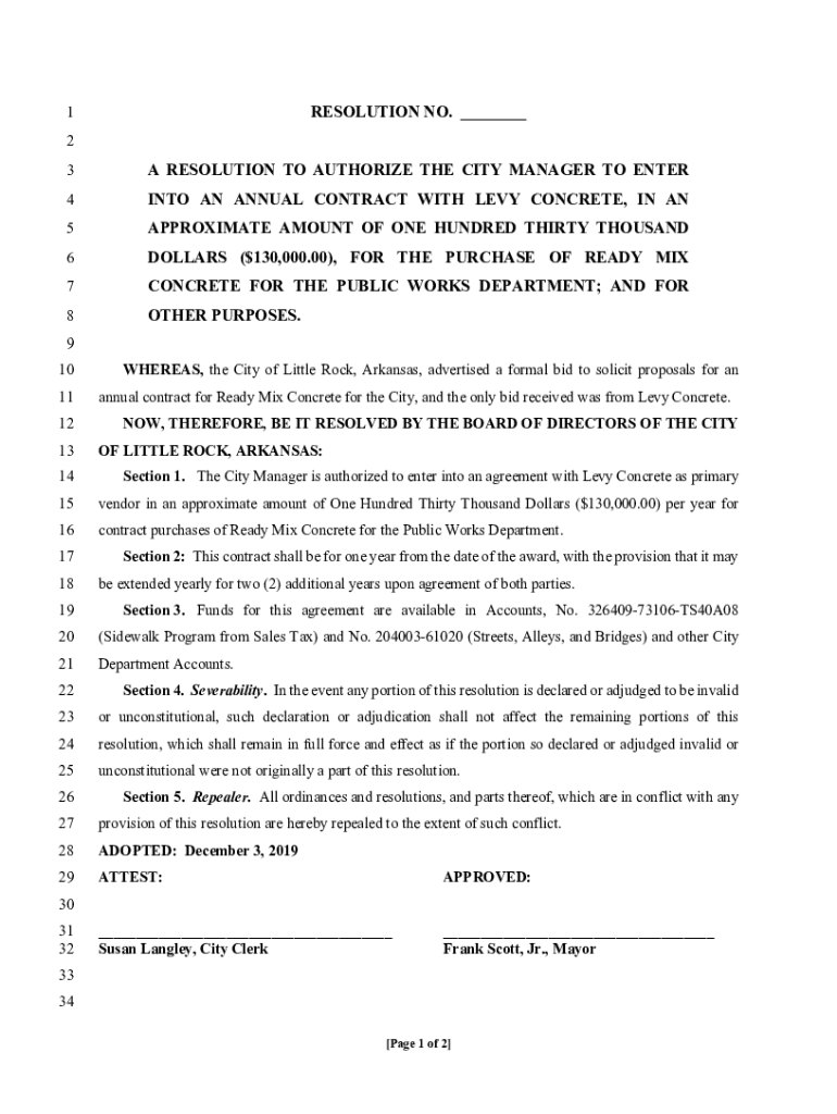 RESOLUTION NO. ___1 2 3A RESOLUTION TO AUTHORIZE THE CITY MANAGER TO ENTER4INTO AN ANNUAL CONTRACT WITH LEVY CONCRETE, IN AN5APPROXIMATE AMOUNT OF ONE HUNDRED THIRTY THOUSAND6DOLLARS ($130,000.00),