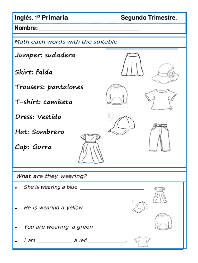 Single. 1 PrimariaSegundo Trimester. Hombre: ___ Math each words with the suitableJumper: sudden Skirt: fall Trousers: pantalones Shirt: camera Dress: Vested Hat: Sombrero Cap: GorraWhat are they