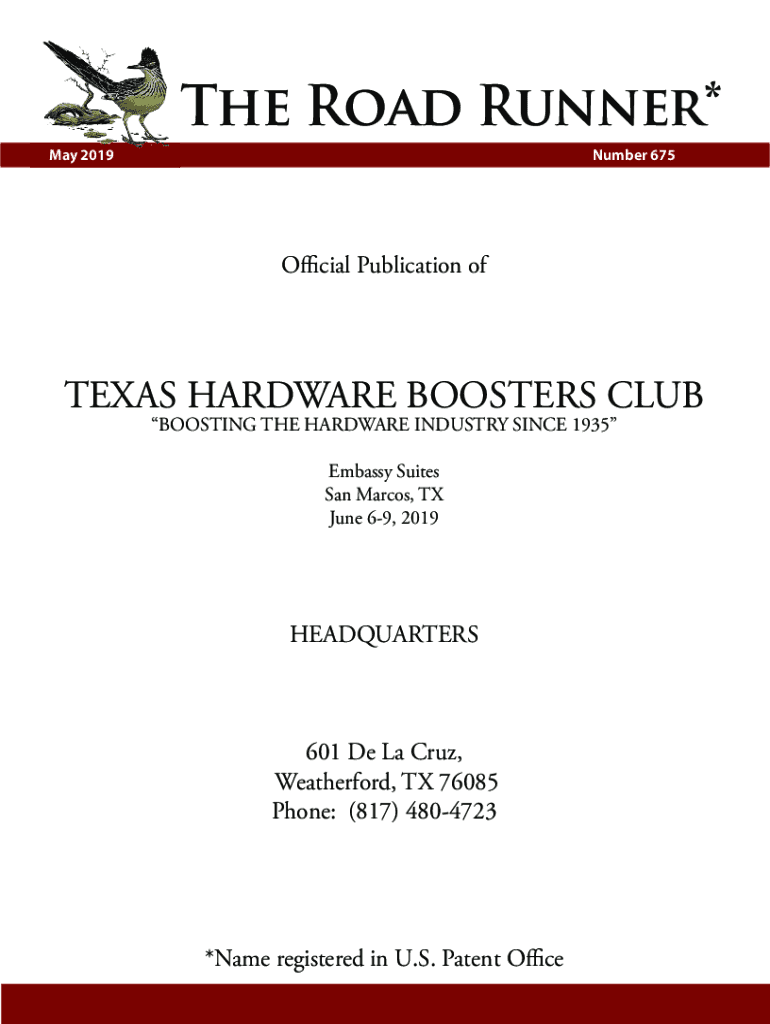 The Road Runner* May 2019Number 675Ocial Publication Texas HARDWARE BOOSTERS CLUB BOOSTING THE HARDWARE INDUSTRY SINCE 1935 Embassy Suites San Marcos, TX June 69, 2019HEADQUARTERS601 De La Cruz, Weatherford,