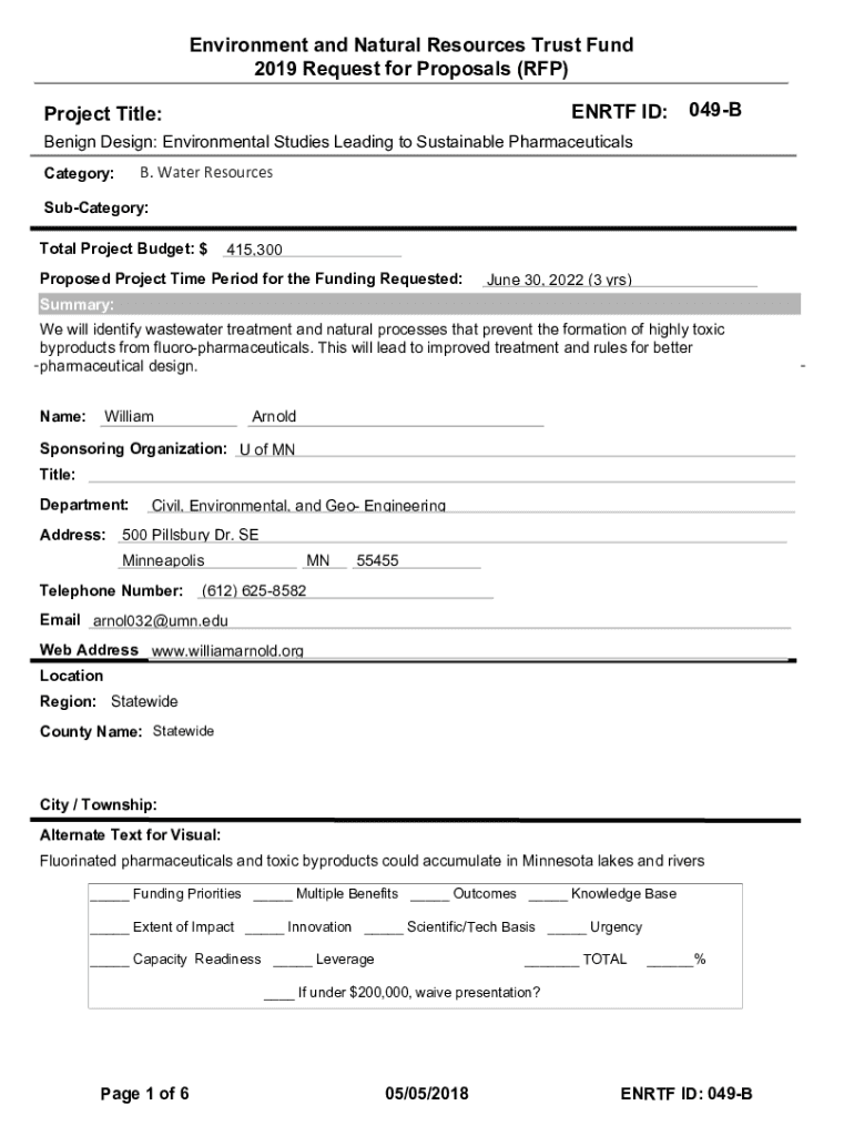 Environment and Natural Resources Trust Fund 2019 Request for Proposals (RFP) EN RTF ID:Project Title:049BBenign Design: Environmental Studies Leading to Sustainable Pharmaceuticals Category:B. WaterResourcesSubCategory: