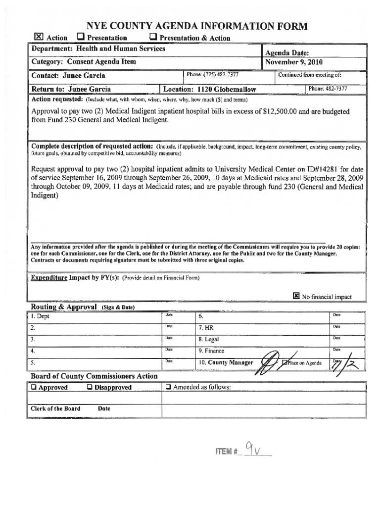 NYE COUNTY AGENDA INFORMATION FORM1&1 Action 1:1 Presentation1:1 Presentation &ActionDepartment: Health and Human ServicesAgenda Date: November 9, 2010Category: Consent Agenda ItemIContact: June GarciaIPhone: