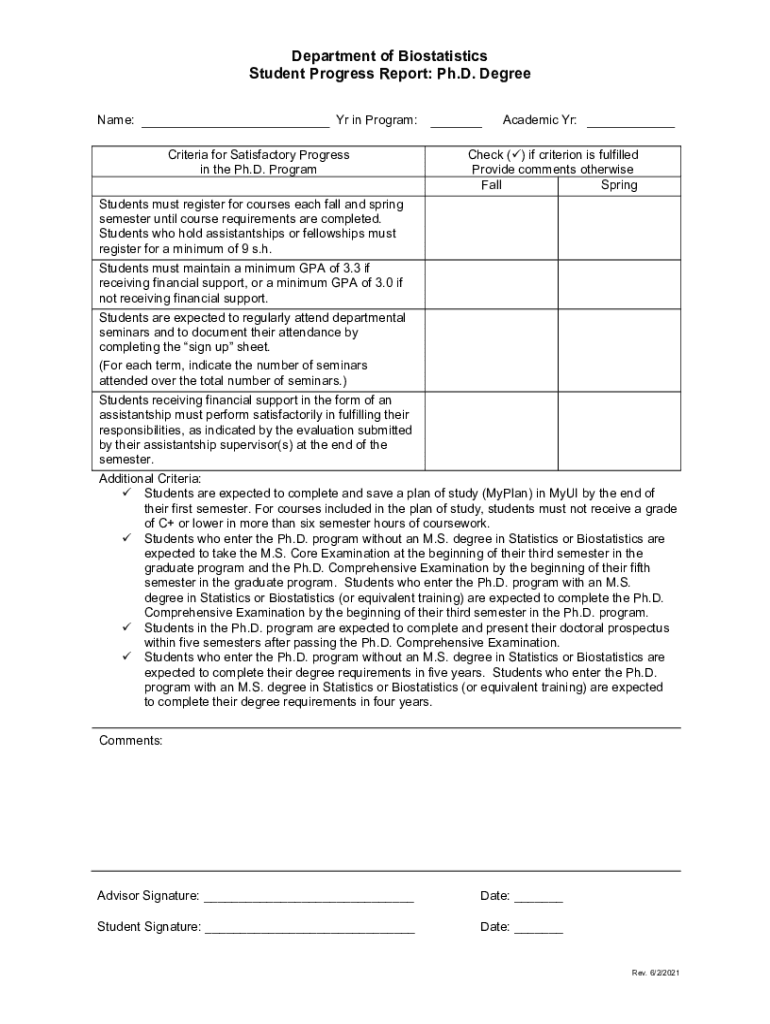 Department of Biostatistics Student Progress Report: Ph.D. Degree Name:Yr in Program: Criteria for Satisfactory Progress in the Ph.D. ProgramAcademic Yr: Check () if criterion is fulfilled Provide