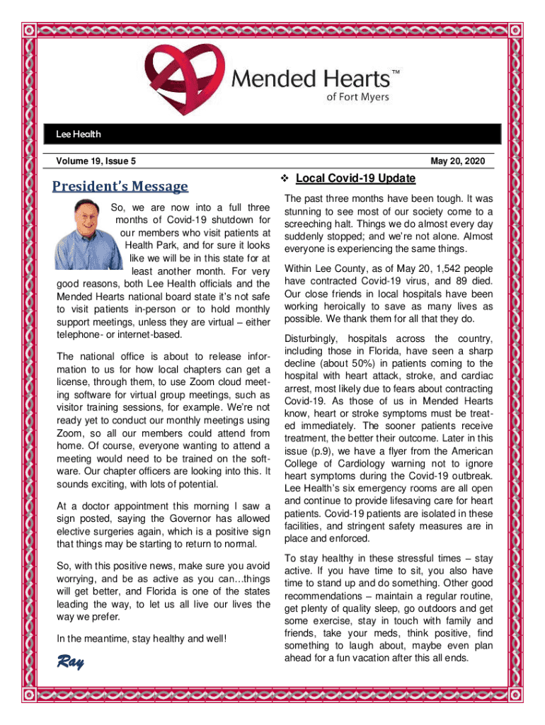 Lee Health Volume 19, Issue 5Presidents Message So, we are now into a full three months of COVID-19 shutdown for our members who visit patients at Health Park, and for sure it looks like we will be