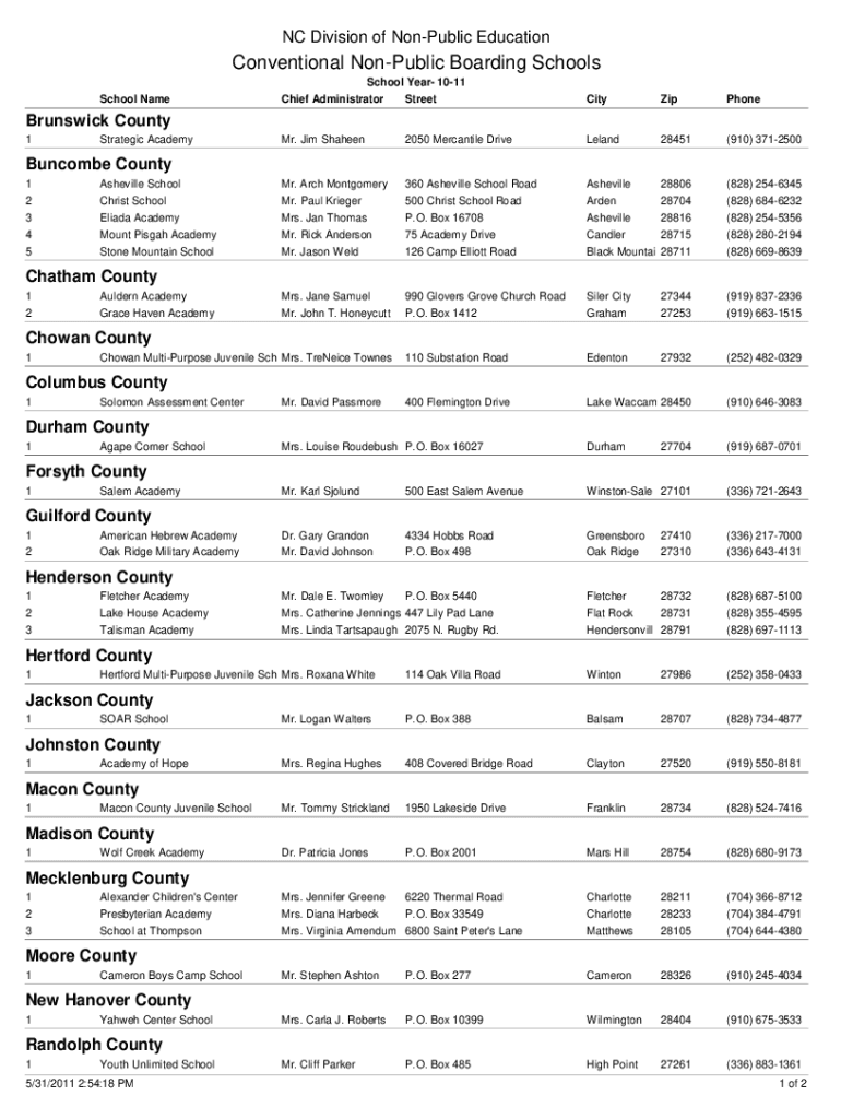 NC Division of Nonpublic EducationConventional Nonpublic Boarding Schools School Year 1011 School Tallchief AdministratorStreetCityZipPhoneMr. Jim Shaheen2050 Mercantile DriveLeland28451(910) 3712500Mr.