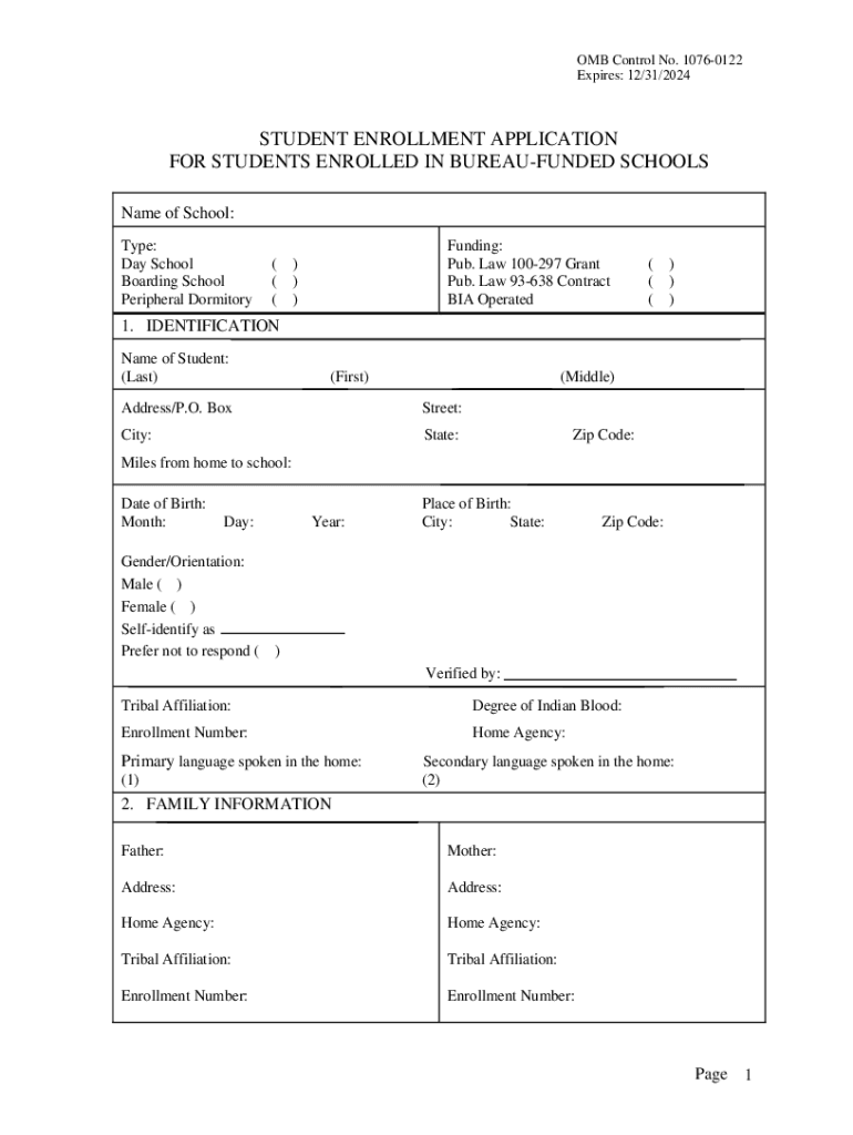 OMB Control No. 10760122 Expires: 12/31/2024STUDENT ENROLLMENT APPLICATION FOR STUDENTS ENROLLED IN BUREAUFUNDED SCHOOLS Name of School: Type: Day School Boarding School Peripheral Dormitory(((Funding: