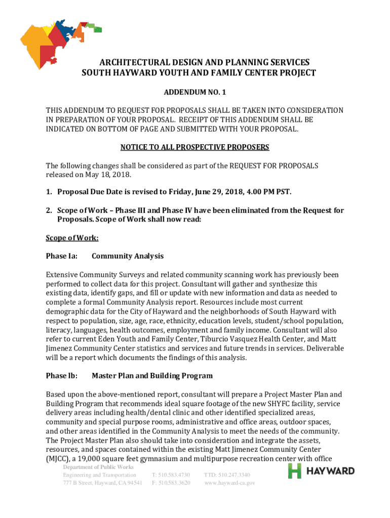 ARCHITECTURAL DESIGN AND PLANNING SERVICES SOUTH HAYWARD YOUTH AND FAMILY CENTER PROJECT ADDENDUM NO. 1 THIS ADDENDUM TO REQUEST FOR PROPOSALS SHALL BE TAKEN INTO CONSIDERATION IN PREPARATION OF YOUR