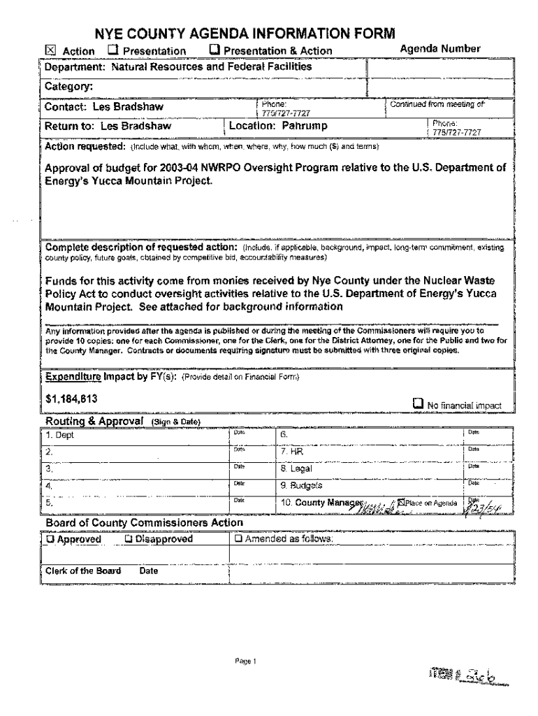 NYE COUNTY AGENDA INFORMATION FORM Action 0 Presentation 0 Presentation & Action Department: Natural Resources and Federal FacilitiesLocation: PahrumpReturn to: Les Bradshaw Action requested:Agenda