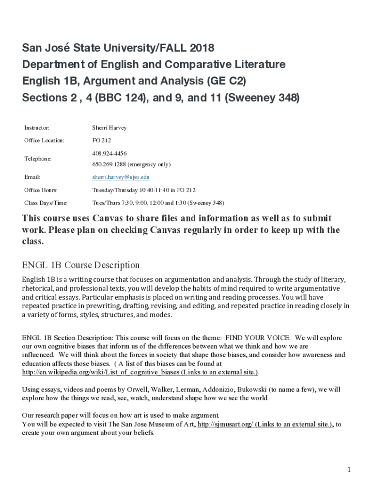 San Jo's State University/FALL 2018 Department of English and Comparative Literature English 1B, Argument and Analysis (GE C2) Sections 2, 4 (BBC 124), and 9, and 11 (Sweeney 348) Instructor:Sherri