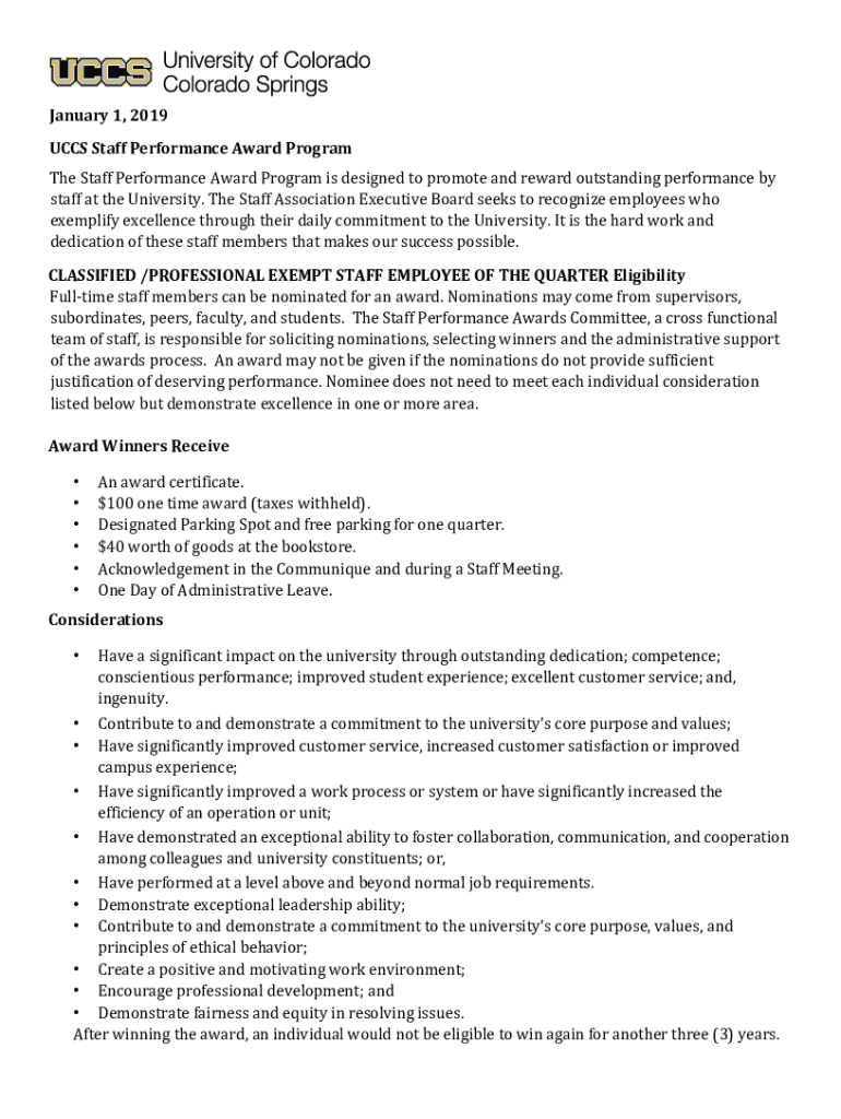 January 1, 2019, CCS Staff Performance Award Program The Staff Performance Award Program is designed to promote and reward outstanding performance by staff at the University. The Staff Association