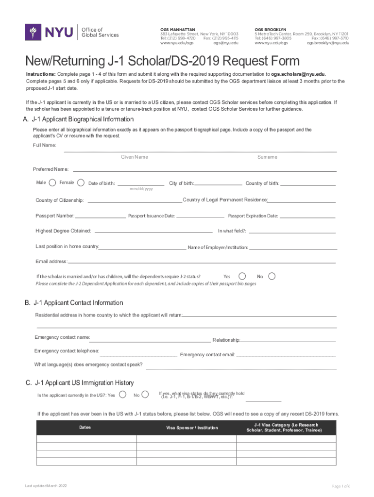 Office of Global Services MANHATTAN 383Lafayette Street, New York, NY 10003 Tel: (212) 9984720 Fax: (212) 9954115 www.nyu.edu/ogs ogs@nyu.eduOGS BROOKLYN 5 Betroth Center, Room 259, Brooklyn, NY 11201