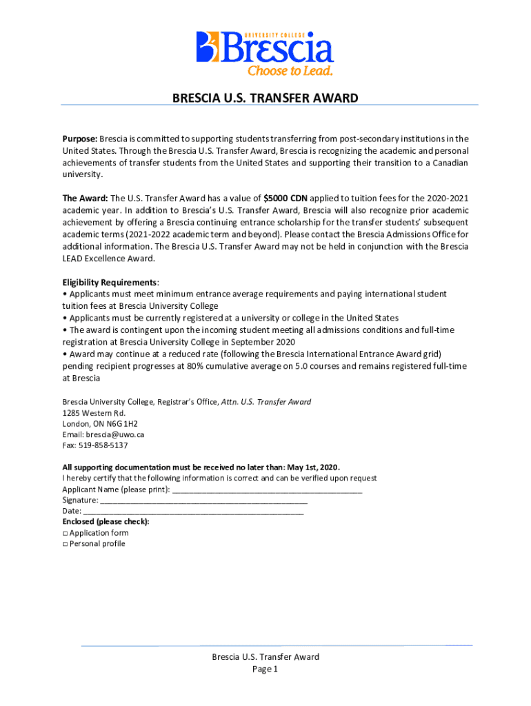 BRESCIA U.S. TRANSFER AWARD Purpose: Brescia is committed to supporting students transferring from postsecondary institutions in the United States. Through the Brescia U.S. Transfer Award, Brescia
