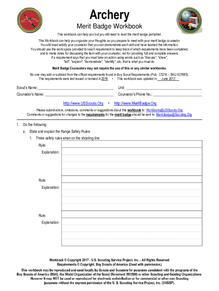 Archery Merit Badge Workbook This workbook can help you, but you still need to read the merit badge pamphlet. This Workbook can help you organize your thoughts as you prepare to meet with your merit