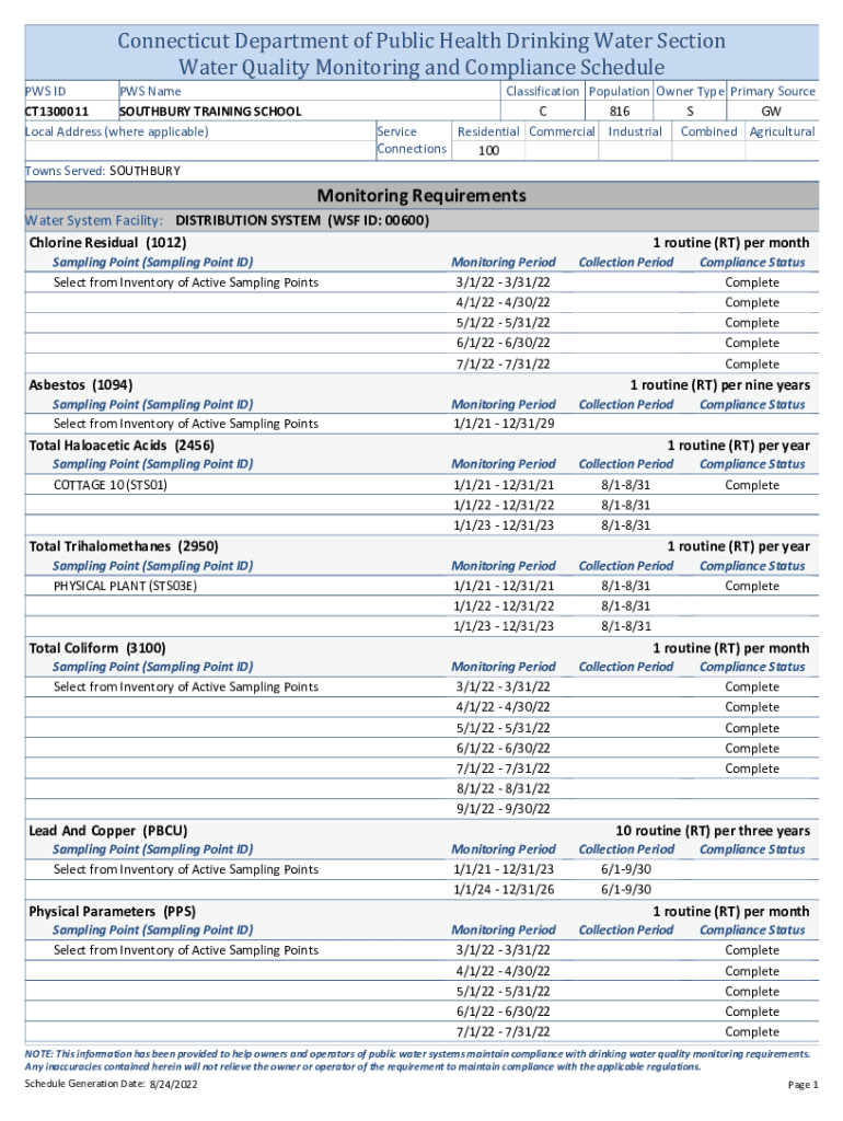 Connecticut Department of Public Health Drinking Water Section Water Quality Monitoring and Compliance Schedule PCs ID PCs Name CT1300011 SOUTHERN TRAINING SCHOOL Local Address (where applicable)Classification
