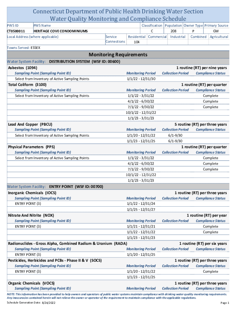 Connecticut Department of Public Health Drinking Water Section Water Quality Monitoring and Compliance Schedule PCs ID PCs Name CT0500011 HERITAGE COVE CONDOMINIUMS Local Address (where applicable)Classification