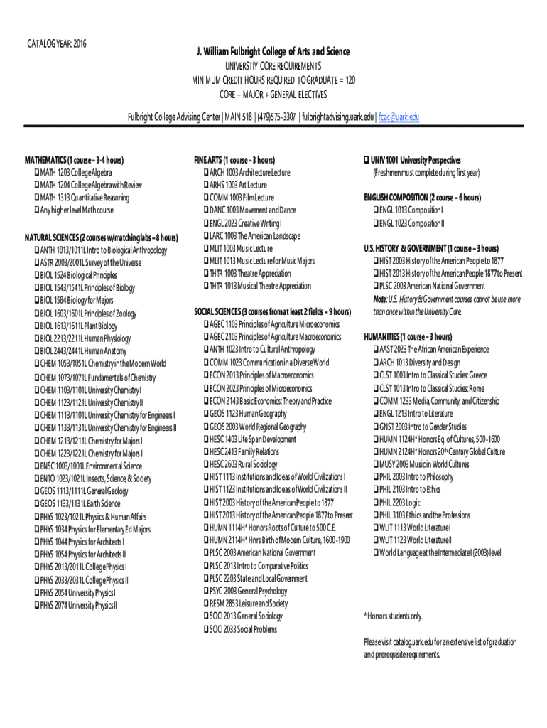 CATALOG YEAR: 2016J. William Fulbright College of Arts and Science UNIVERSITY CORE REQUIREMENTS MINIMUM CREDIT HOURS REQUIRED TO GRADUATE 120 CORE + MAJOR + GENERAL ELECTIVES Fulbright College Advising