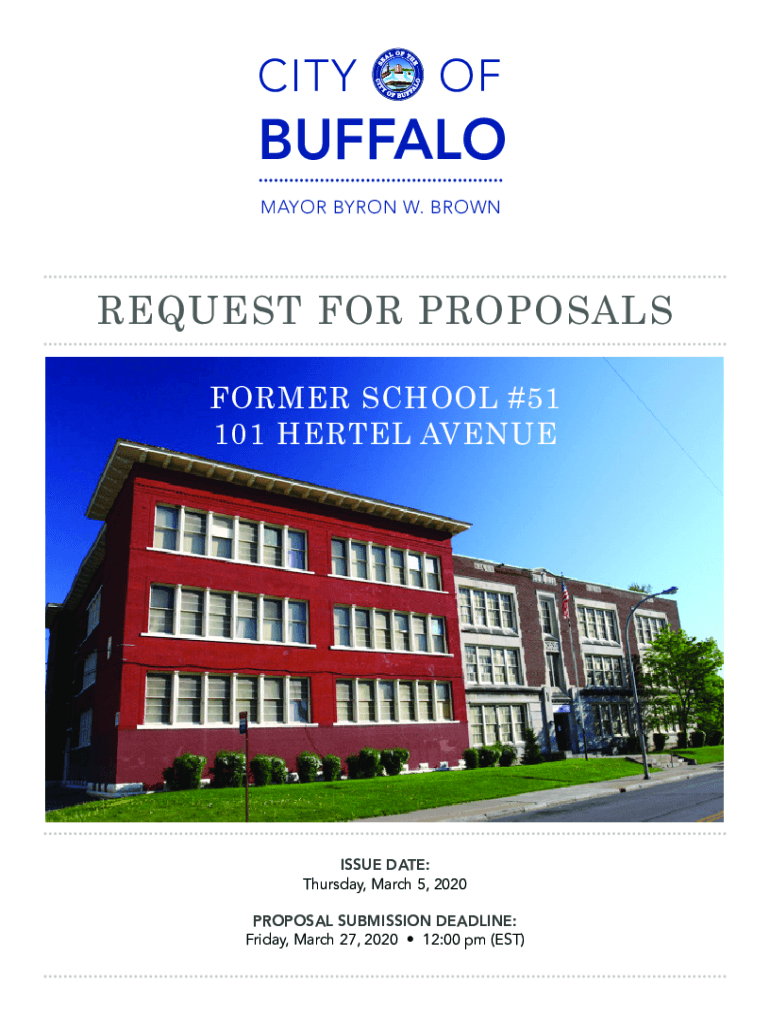 CITYOFBUFFALO MAYOR BYRON W. BROWNREQUEST FOR PROPOSALS FORMER SCHOOL #51 101 HERE AVENUEISSUE DATE: Thursday, March 5, 2020, PROPOSAL SUBMISSION DEADLINE: Friday, March 27, 2020 12:00 pm (EST)CITY