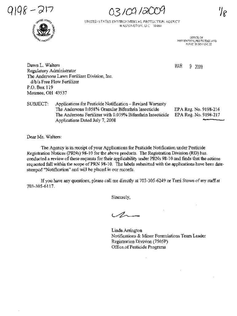 \'J03101 /0lCd1 UNITED STATES ENVIRONMENTAL PROTECTION AGENCY WASHINGTON. D. C 20460OFFICE OF Prevention, Pesticides Mm RO\”)([c SUBSTANCES Dawn L. Walters Regulatory Administrator The Anderson's